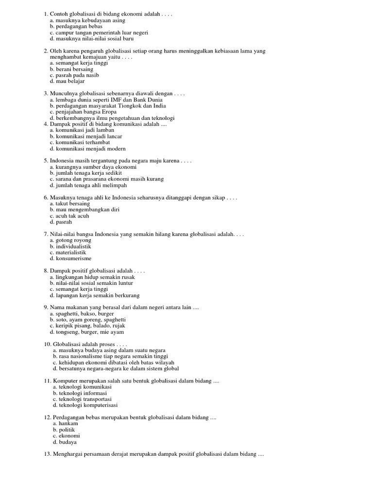 Globalisasi pada dasarnya merupakan istilah bebas nilai yang artinya globalisasi ini tidak terikat pada produk wacana tertentu dan bebas dipakai bagi siapapun untuk melihat perubahan dunia yang semakin solid dan multidimensional dari segi ekonomi, politik, sosial, budaya, maupun hal lainnya sebagai akibat dari adanya kompresi ruang dan waktu. Munculnya globalisasi pada dasarnya diawali dengan berkembang nya ilmu teknologi dan komunikasi. Adanya lembaga dunia seperti bank dunia dan imf. Tuliskan jawaban anda pada lembar jawaban yang tersedia dengan menggunakan bolpoin 5. Penjajahan bangsa eropa 1 lihat.